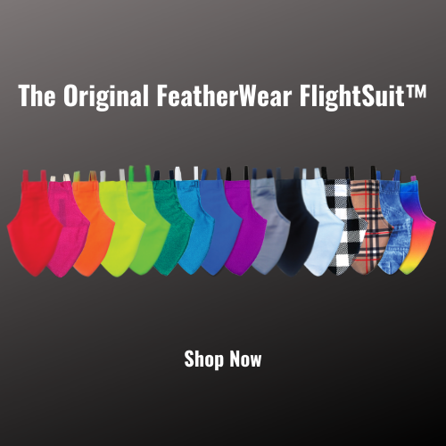 Our signature product, the FeatherWear FlightSuit®! Born out of a need to keep our homes and shoulders free from messy bird poop while also allowing our birds to move freely and live their best birdie lives. Our Suits were designed and patented over 25 years ago and have changed the bird industry, allowing more time for pet birds to be out of the cage to spend time with you in and out of the home. After all, spending quality bonding time is vital to your bird's overall health and well-being. We proudly produce a variety of sizes, colors, patterns and styles with every size of bird in mind. We are constantly chirping away at new ideas to keep your bird the center of attention! Our comprehensive size chart and detailed measurement instructions will insure a proper fit. We have added leashes and liners to give your birds more freedom to stretch their wings and also allow you to extend the wear life of your FlightSuit®!